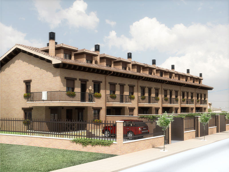 Creo que falla un poco la textura a la valla en los ladrillos, la carretera la oscurecería un poco o bastante más, la acera le falta relieve y los árboles y plantas se repiten, pero como lo que cuenta son los adosados, creo que están muy bien.