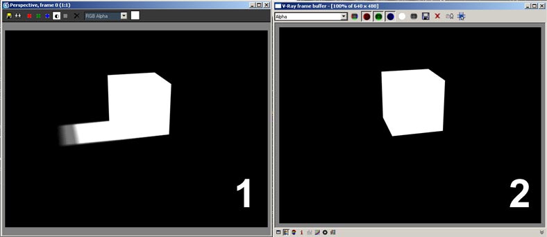 Renderizado en Vray 1.5 adv rc3, sobre un video, haciendo tracking, lo que no sé es cómo hacer el piso y este me proyecte las sombras, con el Scanline sale así (1) el canal alpha, pero con el Vray no puedo lograr eso solo esto (2).