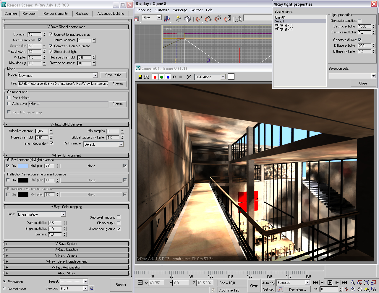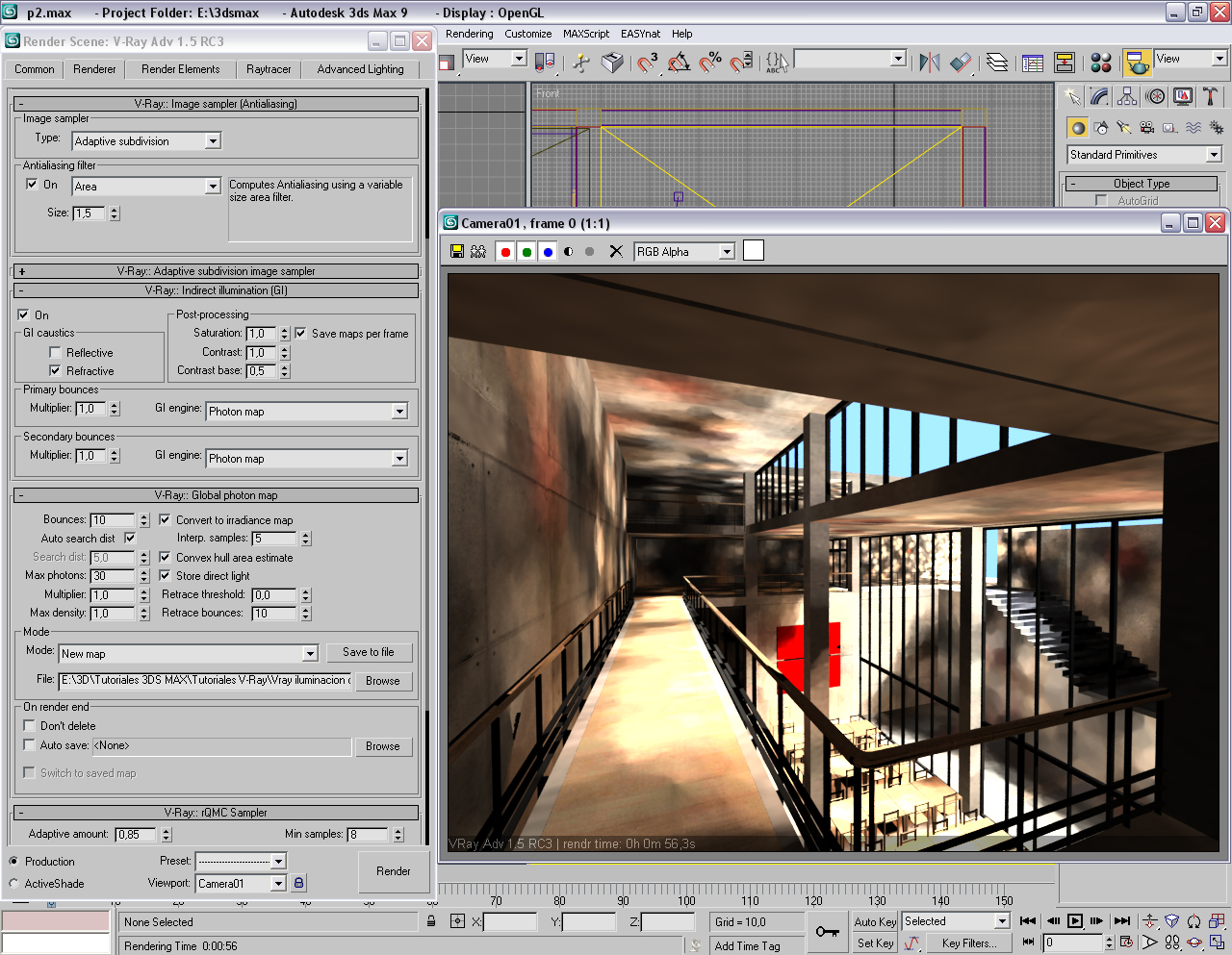 Gracias por tu pronta respuesta, bueno la verdad es que estoy enviando la imagen de configuración del Photon Map es decir no es la imagen final, es la imagen del mapa de fotones que por más que la configuro no me salen los fotones cómo se supone, en la imagen está en automático, pero he probado hasta la configuración 1 a 5 que propone Dideje y nada, no doy con la cosa. La idea es recoger el Photon Map para utilizarlo luego para el cálculo de Irradiance Map y posteriormente animar, (estoy en proceso de aprendizaje) la escena que ves es interior de un conocido tutorial ahí sale sin cristales para hacer los dos cálculos de los maps, lo que necesito saber es que debo cambiar a la configuración para lograr el Photon Map adecuando.