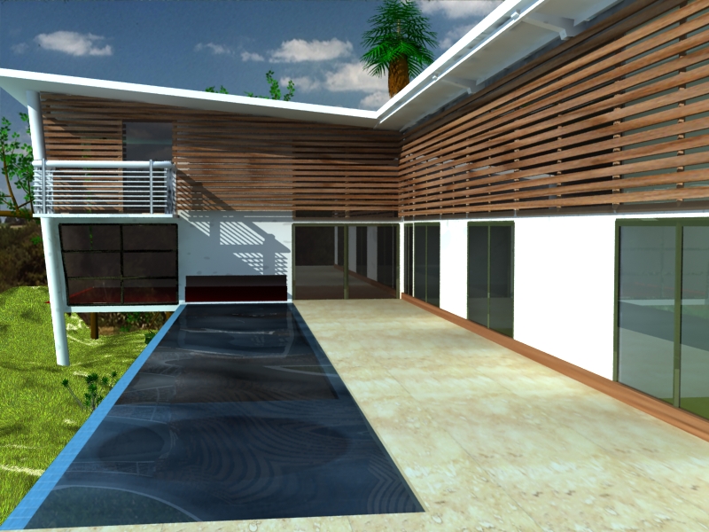 Se ve bastante bien para ser un primer render en Vray, hay algunas cosas que no se ven muy bien, como, por ejemplo, el piso de madera es muy madera natural, me explico: esta muy no elegante como para el diseño, la palmera del fondo no se le viene mucho como adorno y el agua se podría mejorar.