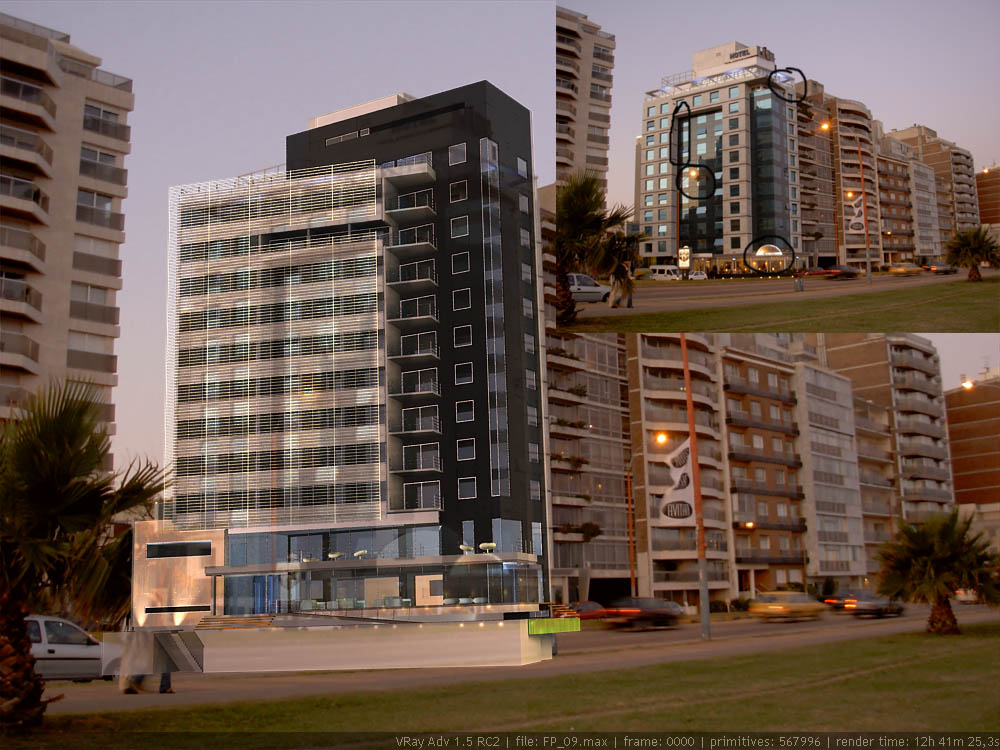 También puedes renderizar tu edificio sin el fondo y guardarlo en tif o (*.tga) con canal de transparencia y componer posteriormente en Adobe Photoshop o similares, así puedes ajustar el color, tono y demás de tu edificio y tu fondo por separado, yo lo encuentro más práctico y flexible.