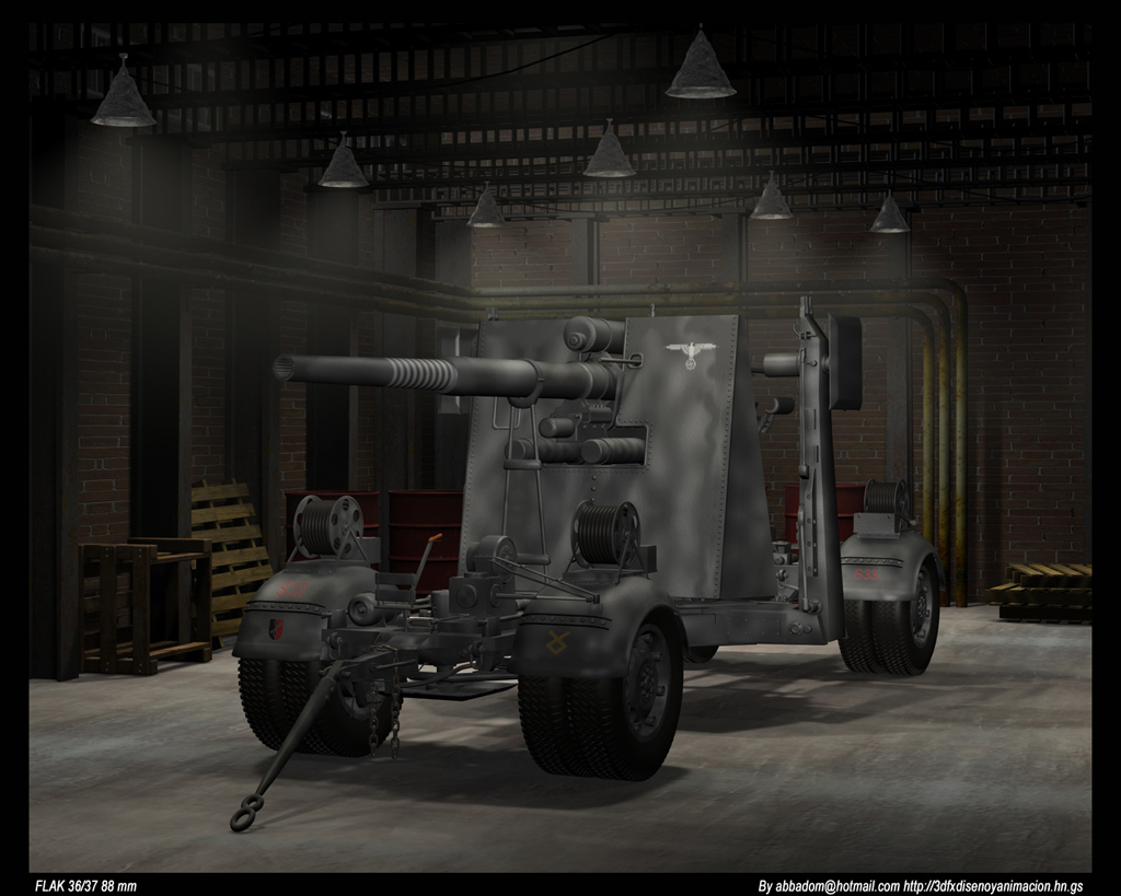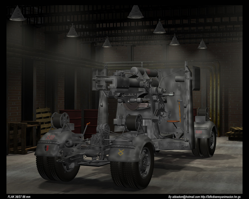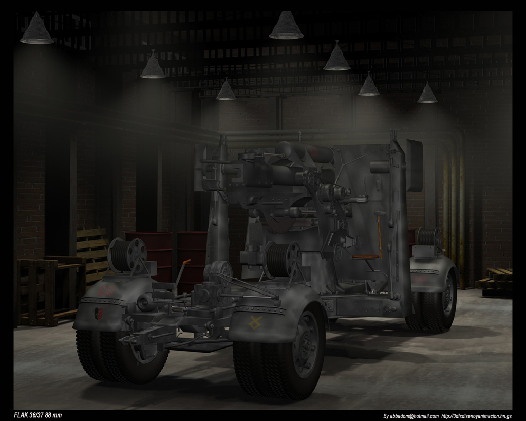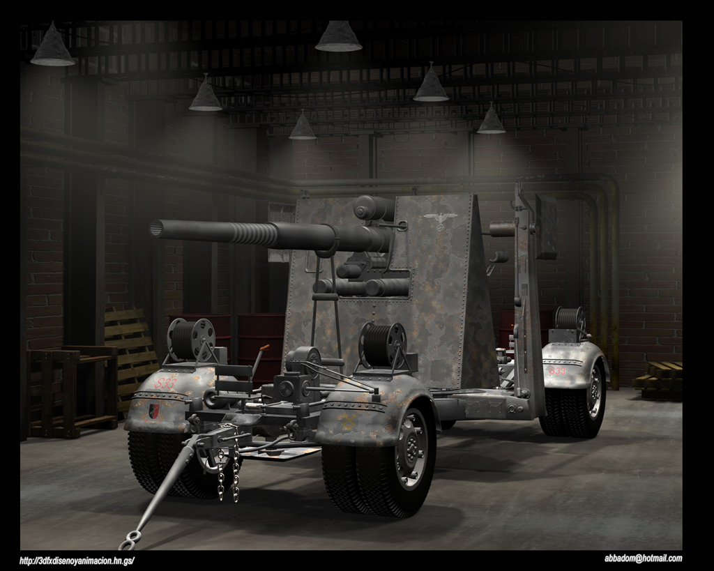 Muy bueno ese modelado. Parece como si estuviese esperando la ocasión para liarme a tiros con el vecino. En mi opinión, es curioso, pero me parece que está mejor iluminado el resto de la escena que el propio Flak, para empezar te aconsejaría que le dieses un poco más de especularidad a la pintura (utiliza un procedural) ya que echo de menos un poco más de brillo, ya sé que la pintura es mate, pero un poco de especularidad no le vendría mal (en mi modesta opinión), luego y ya para rizar el rizo, haría que le entrase la luz del sol, como si lo fuesen a sacar para darle un paseo los domingos al campo de tiro. Eso reforzaría la iluminación que de por si es escasa y le daría movimiento y expectación a bicho, si lo enciendes y sale humo, ni te cuento. World war a la vista.