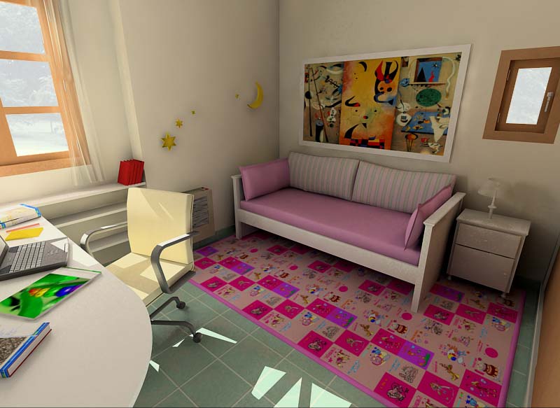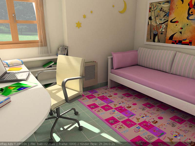 A ver, de repente esos libros que están apoyados en el marco de la vantana, podrías ponerles colores diferentes, por ejemplo, esa luna y estrellas, son dibujos empastados en el muro o objetos volando que dan somra? (manchas), la lámpara del velador no tiene base? Parece como enterrada en él, esta buena esa cortina, podrías darle otra materialidad que no fuera esa, para que se note más quizás.