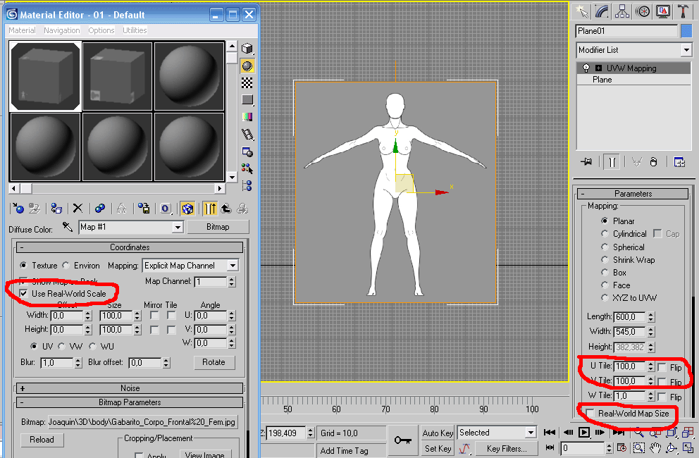 Hola, hice lo siguiente y ya puedo empezar, saque la selección de use real-world en el material, y en los parámetros de UVW mapping y en los del plano, después en los parámetros de UVW mapping, puse 100 en los campos u Tile y v tile, de ahí fui al sub objeto gizmo, y lo centre, no sé si es lo correcto, a lo mejor este bitmap guarde esa proporción, pero no creo que con todos se pueda hacer lo mismo.
