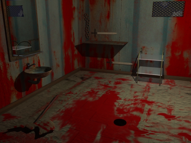 Bueno, si es tu primer trabajo, pues serás consciente que cada día se aprende y se mejora, así que, a ponerle ganas, así te diré un poco por encima que tienes que trabajar muchas cosas, pero poco a poco, no te agobies, para empezar, la iluminación, aunque es un tema que veras que hay múltiples modos de iluminar y ya te iras adaptando al que más te convenga, sobre las texturas, pues sobre utilizas el Bump (la segunda fotografía) y además en esta creo que metiste una textura como de ladrillo, las texturas no se basan en coger las que te vienen con el software y adaptarlas, que, aunque bien esto te puede venir bien en ocasiones, pero no siempre, con unas buenas texturas acordes a la escena, todo mejora mucho, del modelado, pues no sé qué decirte, está casi todo echo con primitivas, así que, no me voy a meter. (¿el grifo lo has echo tú?), hay unas huellas en el suelo que parecen de algo gigante, tan gigante que dudo que quepa en la habitación, y una exageración de sangre (que también te han comentado parece pintura), por ejemplo, la rejilla que hay puesta no está manchada, parece que se puso hay después de que pasara algo en la habitación que la lleno de sangre.