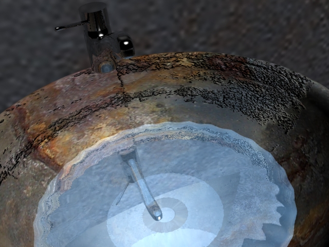 El agua no debe ser tan clara. No pega ese grifo tan brillante, eso sí, está bien modelado, pero debería estar oxidado o al meno sucio para estar en consonancia con el resto de la escena.