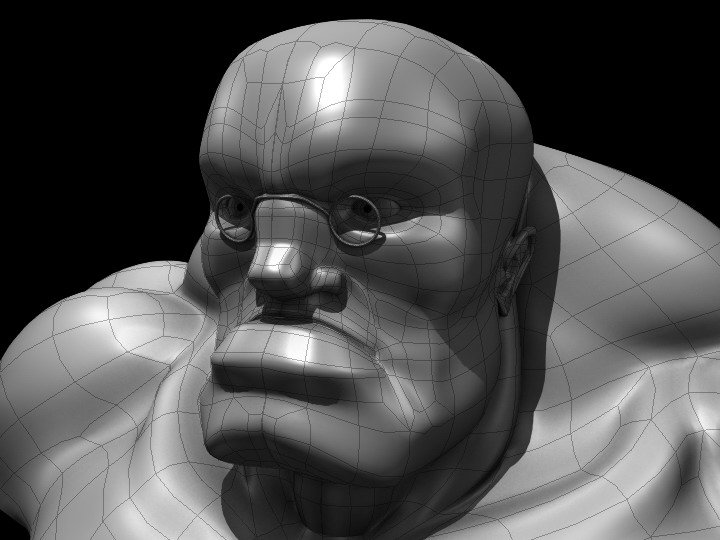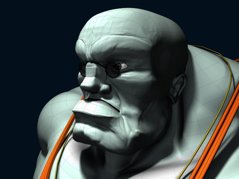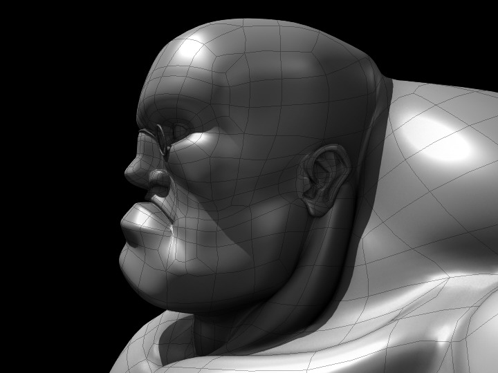 Pues la malla la veo muy bien, y me llama la atención como has organizado las aristas en el entrecejo. Están originales. Bueno, lo que sí te digo, es que tienes un pentágono (dos, por la simetría) en la zona central, donde acaba la frente. No sé si está hecho adrede, pero por si acaso, te lo digo, ah. Me gusta mucho la pinta de bruto que le da la oreja esa tan pequeña. Me gusta mucho su desproporción y su localización respecto al resto de la cabeza. A ver cómo acaba, que tiene una pinta estupenda. Posdata: Ya he visto el puesto de palomitas, y aquí sigo comiéndomelas.