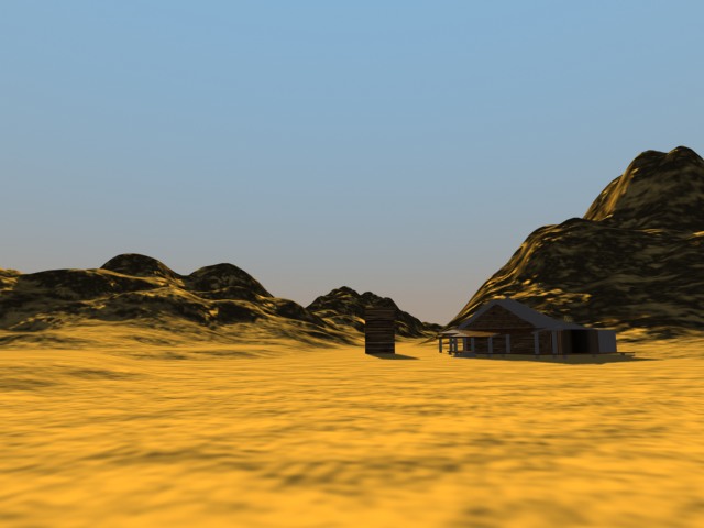 Estoy haciendo un desierto con montañas y un rancho con un deposito de agua, típico de por esos sitios. Pero la iluminación no la consigo del todo. A ver si me podéis aconsejar. Os dejo un screen.