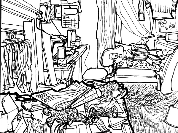 Están muy interesantes tus dibujos, tal vez lo único que yo cambiaría es la falta de sombreado. Hace que tus dibujos sean algo planos. Y en algunos (como el de la habitación con las cosas desordenadas) se vuelven confusos al perder la tridimensionalidad.