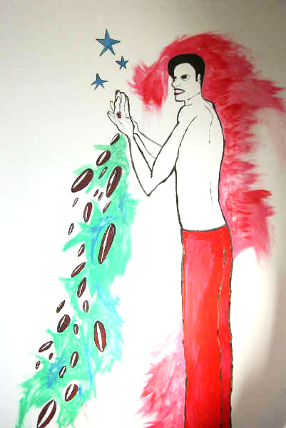 Se trataba de un café fair trade en sydney, esto era sobre comprar café a zonas tribales de papua nueva guinea y otros países subdesarrollados al mismo precio que ha grandes compañías productoras de café, así que, decidí hacer política con el mural y mostrar lo que yo creo apropiado, los colores y las figuras remiten a eso y cada parte fue pensada como una propuesta. Al fin y al cabo fue muy político para el cliente y decidió contratar otros artistas para terminarlo, pero quien me quita lo bailado.