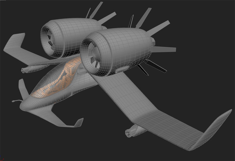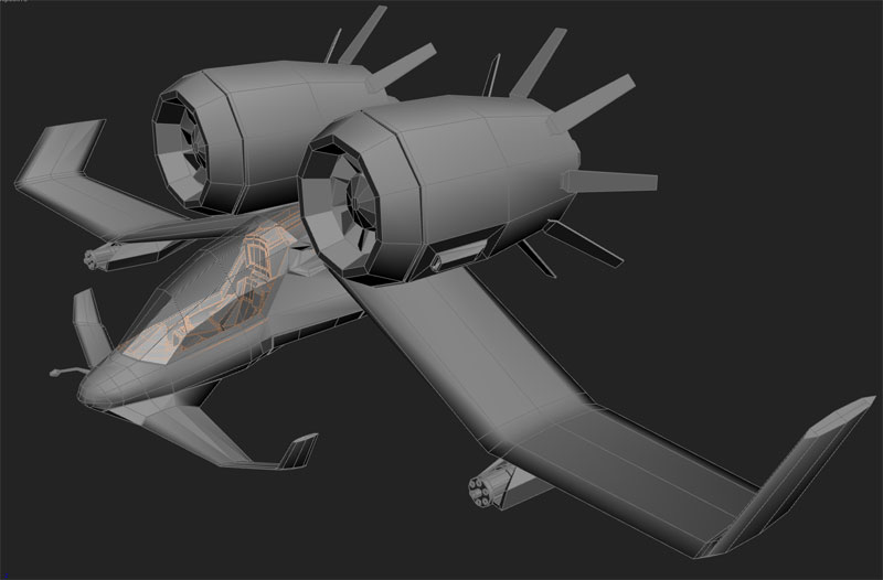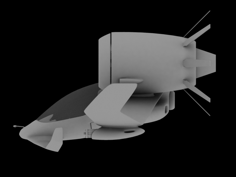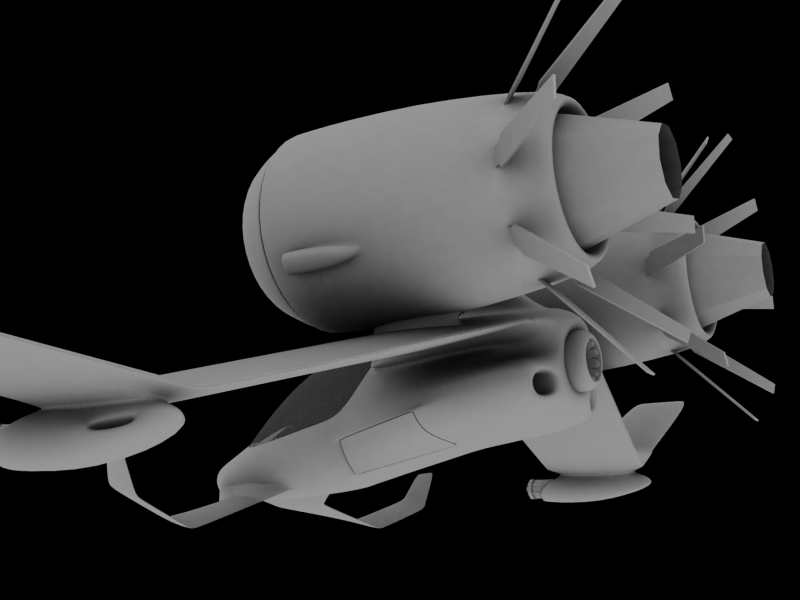 Unos incisos. Planeador: vehículo sin motor que planea. Así que con esos pedazos motores ya me dirás tú. La idea cojonuda, el modelado, estupendo. Las aletas que salen de las toberas de los motores deberías de hacerlas escamoteables, es decir accionadas por cilindros hidráulicos, ya que actuarían como aerofrenos. Le faltan más superficies verticales, por lo demás mola un mogollón, ahora a darle texturas.