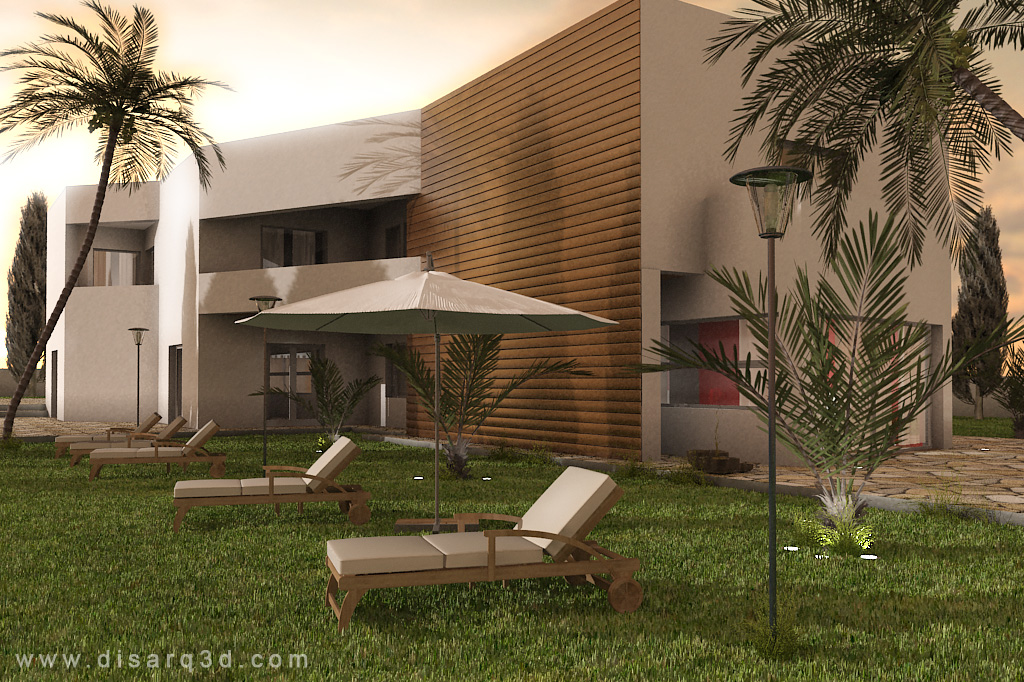 Un trabajo impresionante, la iluminación está muy bien, ese atardecer está muy conseguido, le veo unas cosas, por ejemplo, en la entrada que hay a la derecha se ve una arista que a lo mejor no debería de estar, y las paredes las veo con un poco de ruido, intenta subirle las subvs, de la luz y también el amount en el Quasi Montecarlo, puede ser que a lo mejor te salga un poco mejor.