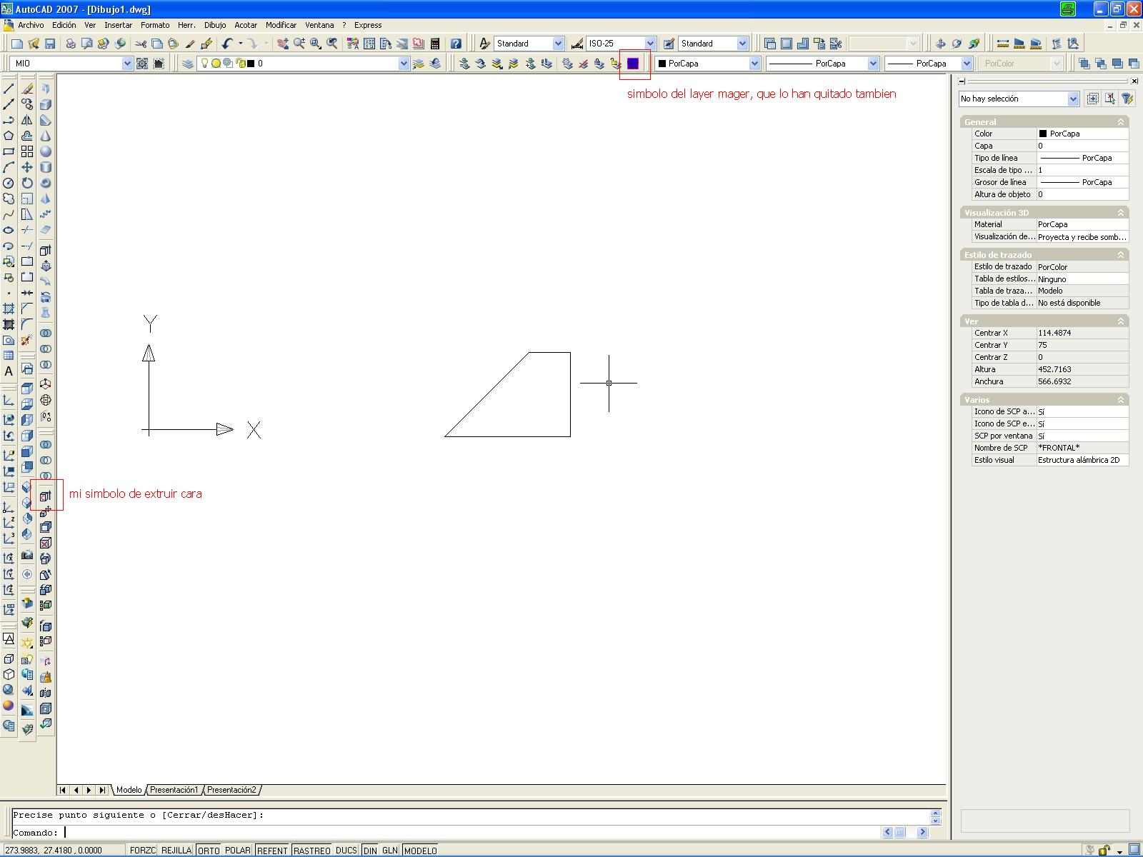 Gracias por tus comentarios, si pueden servirme. Primero si que estaba confundiendo las ordenes extruir, pero es que, en la 2006 si que tenía una barra de herramientas de superficies donde tenía ese extruir y luego otro en la de sólidos, pero en la 2007 echo en falta esa barra de herramientas, así como otros iconos que hacen relación a superficies como, por ejemplo, superficie tabulada, la de generar superficie con 4 lados, esas no tienen iconos, aunque si se pueden escribir como comando.