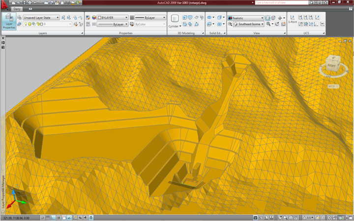 Para realizar el terreno y después el solido, he empleado unas rutinas que me paso un chico de otro foro, el cual no puedo mencionar porque no recuerdo su nombre y tampoco fueron diseñadas por el. Las mando por Megaupload para quien las quiera. La rutina LV se utiliza para generar la malla (deben usarle polilíneas a su correspondiente cota y antes de usar el comando, explotar todas las polilíneas), y la rutina m2s es para transfórmala en solido. La rutina que me pasaron a mí no funcionaba y cómo se de Lisp, encontré e fallo y la corregí. Como la mando a mí me funciona perfectamente. Saludos y gracias. http://www.Megaupload.com/?D=2uq8wjkp.