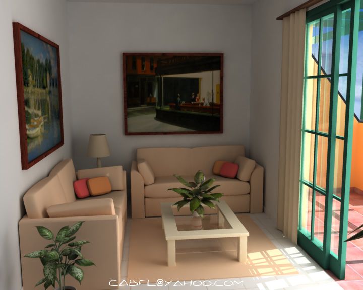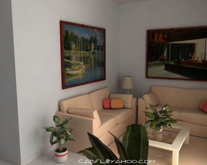 Bueno no sé si lo has puesto para criticar, como comentas que es un trabajo acabado no creo que te interese retomarlo. Pero aun así te digo unas cosas, y así descanso un rato del 3dsmax. Se supone que falta la textura de la lámpara, tapiz, mesa de centro, y sofá no todos tienen el mismo tono. Los sofás tienen una pinta para hincarle un bocadito.