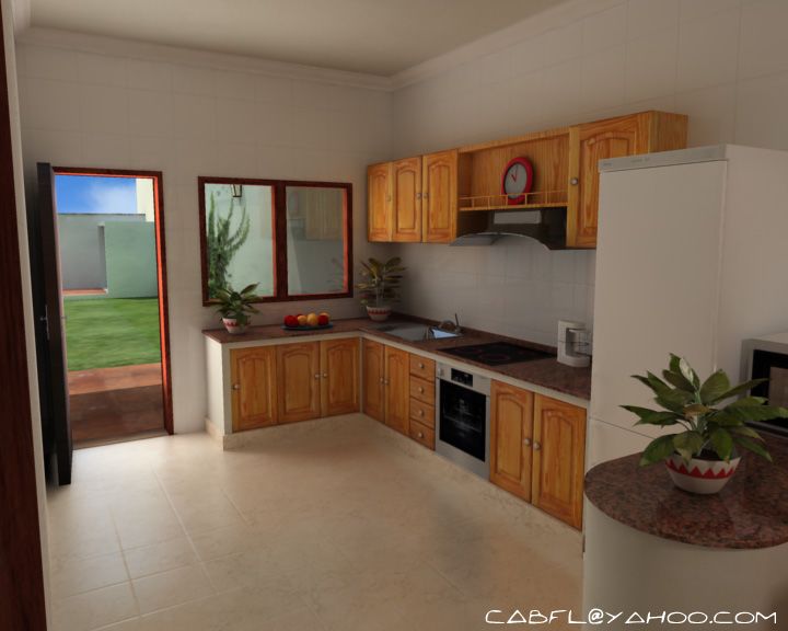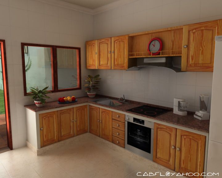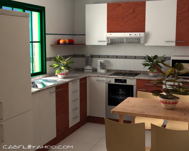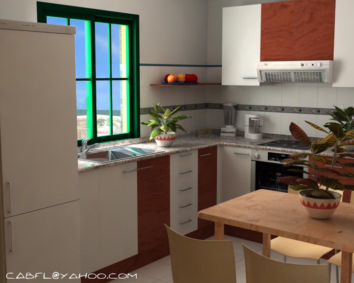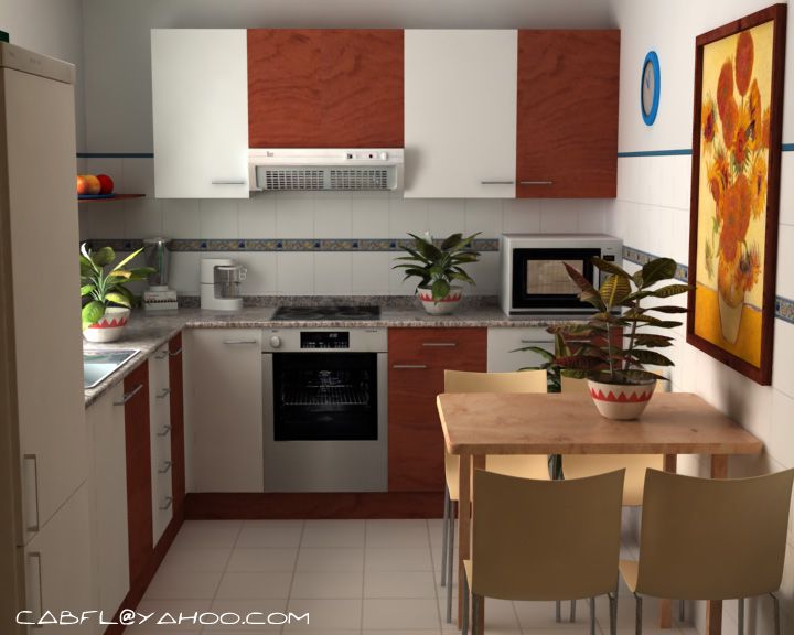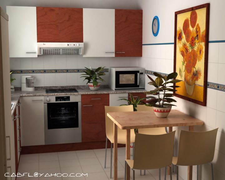 Si las anteriores estaban muy bien, estas están aún mejor. La primera impresión es cojonuda, pero veo varias cosas que, seguro ya sabes. Los azulejos de la pared, así como la madera de los armarios, son muy mate, quedaría mejor con una reflexión o en su defecto con más lustre. Supongo que no lo habrás hecho por los tiempos de render, pero yo lo comento de todas formas.