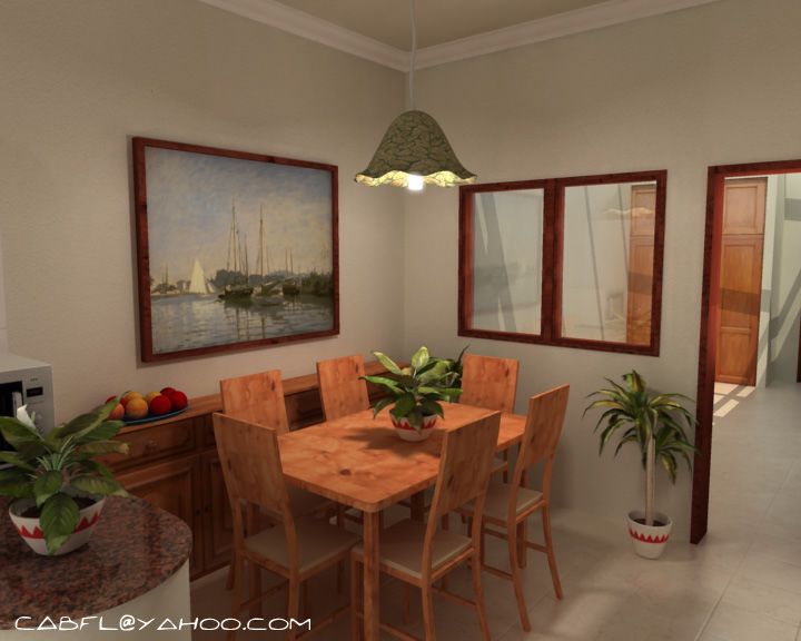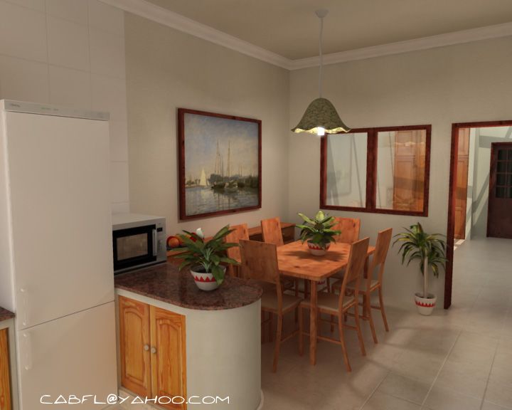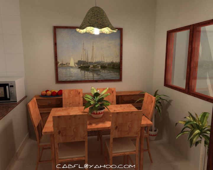 La mesa tiene sobre la superficie horizontal un poco de reflejo difuso, se nota poco, pero ese lujo estuvo a punto de costarme un retraso en la entrega. Lo de CGarchitect. Interesante, a lo mejor me da ambición y subo alguna a ver qué tal cuela. Bueno, me estoy animando así que, voy a añadir otras fotografías de un trabajo anterior, en el que tuve mucho más tiempo y le metí leña al fuego con las calidades de los materiales. Tardó 3 días con 2x Dual Xeon 2, 8 Ghz.