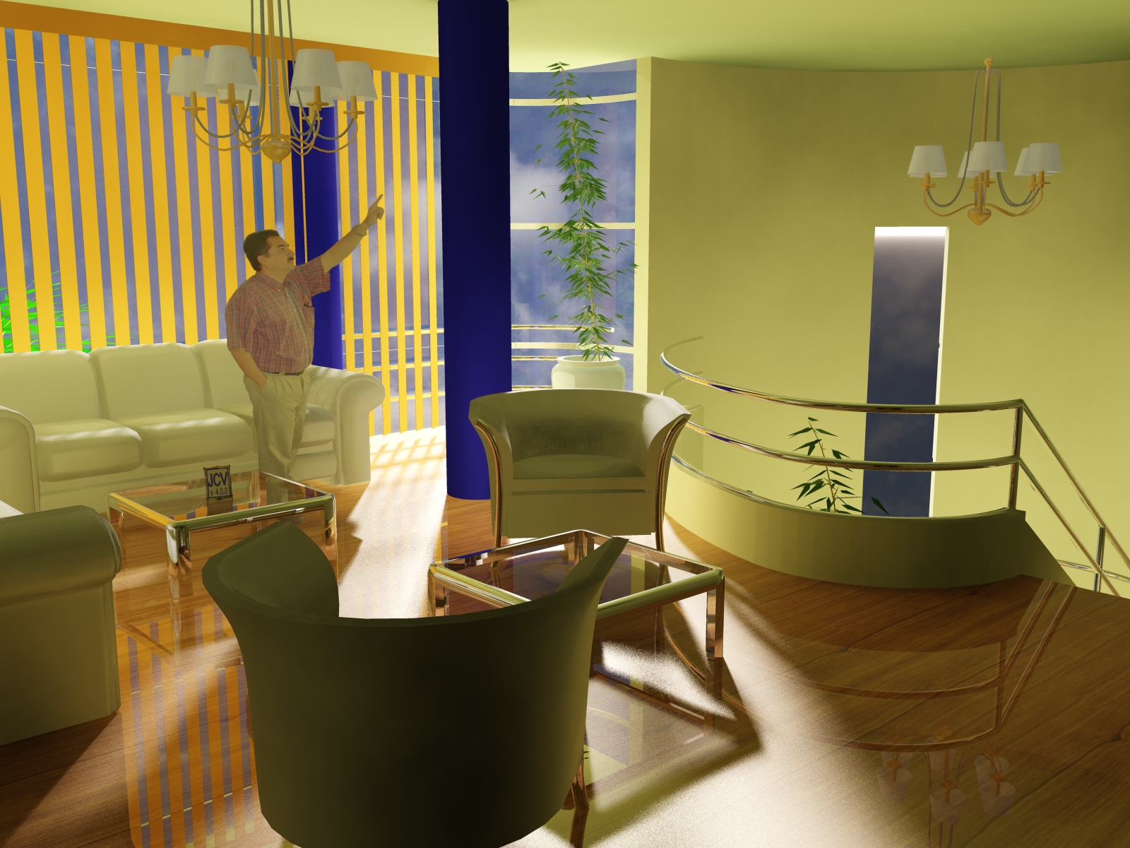 A favor tengo que decir que el señor está bien integrado en la imagen, pero por contra. Las barra amarillas y las columnas cantan demasiado, habría que desaturarlas un poco o algo. Luego, la madera del suelo refleja demasiado, no la pega porque además tiene pinta de ser madera algo desgastada. Por último, se notan los polígonos de las sillas.