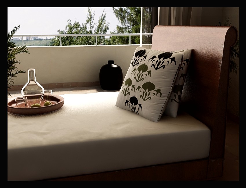 Hola Memfox: Me gusta mucho la imagen, el vidrio está muy conseguido y la textura de los cojines también, yo le daría un poco más de caña al sol, y lo que no me acaba de gustar es el material del jarrón negro.