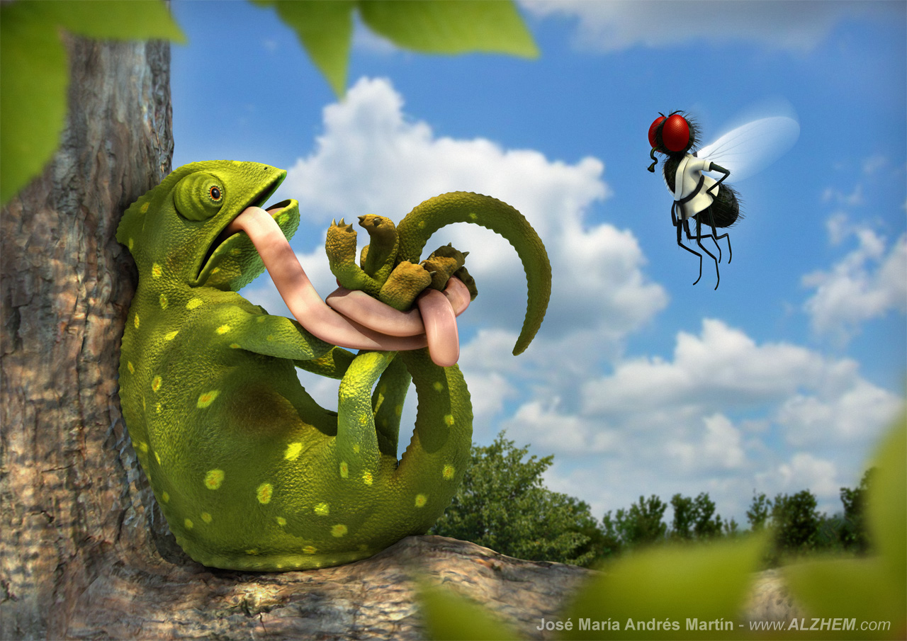 Vaya, que bueno pobre camaleón, gran imagen y la mosca un 10 es de lo mejor, pon alguna cosa más que vayas haciendo que me dejaste con ganas de más.