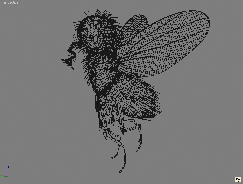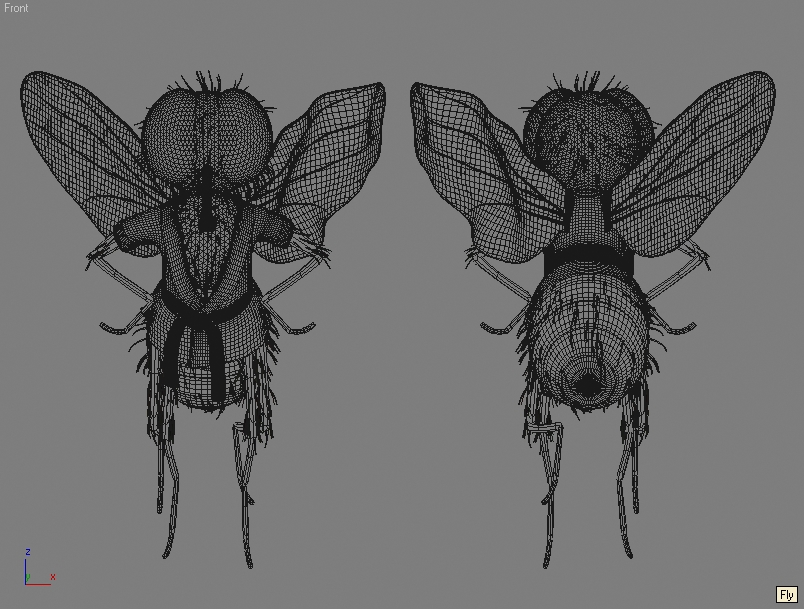 También hay capturas de la malla momentos antes de enviarla a Mudbox, y de la mosca. La distorsión en una de las alas de ésta tiene su intención y es producir mejores reflejos, aunque al final, el Motion Blur se los comió con patatas.