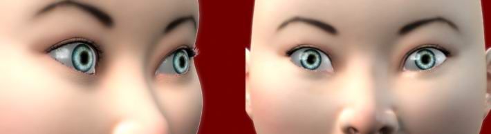 Con lo de los ojos te doy toda la razón, siempre que se ve completamente el iris, o incluso se ve parte blanca por encima o debajo del iris, es porque esos ojos están muy abiertos, es algo que tengo en cuenta, la razón es que estoy modelando en LightWave y texturizando y renderizando en 3dsmax, y para trabajar las texturas-iluminación tengo un modelo base, con más geometría de la necesaria y modificarlo en 3dsmax (tipo hacerle algún Morph para cerrarle un poco los ojos), sería mucho coñazo, así que, de momento acabaré la text-ilum, y después importaré el modelo definitivo, que además tiene más geometría por abajo del cuello.