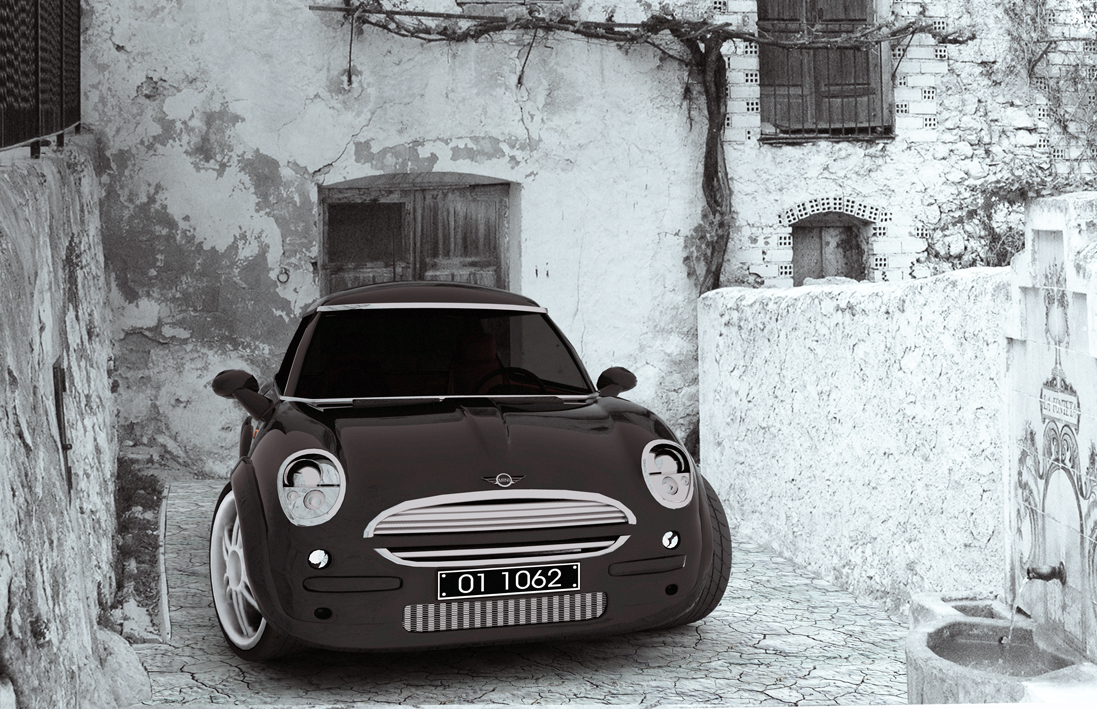 Has desaturado en exceso y los colores son antinaturales, el mini no pega, parece gigante y demasiado brillante. El suelo dudo si está modelado o es de la fotografía real, pero el fondo es supercojonudo, así que, déjalo con sus colores naturales e intenta intgrar mejor el mini, matando brillos y reflejando las paredes, pero en los laterales sólo, evidentemente en el capó debería lucir el cielo azuleete. Otra prueba por favor, y muestra el fondo original. Un saludo y ánimo.