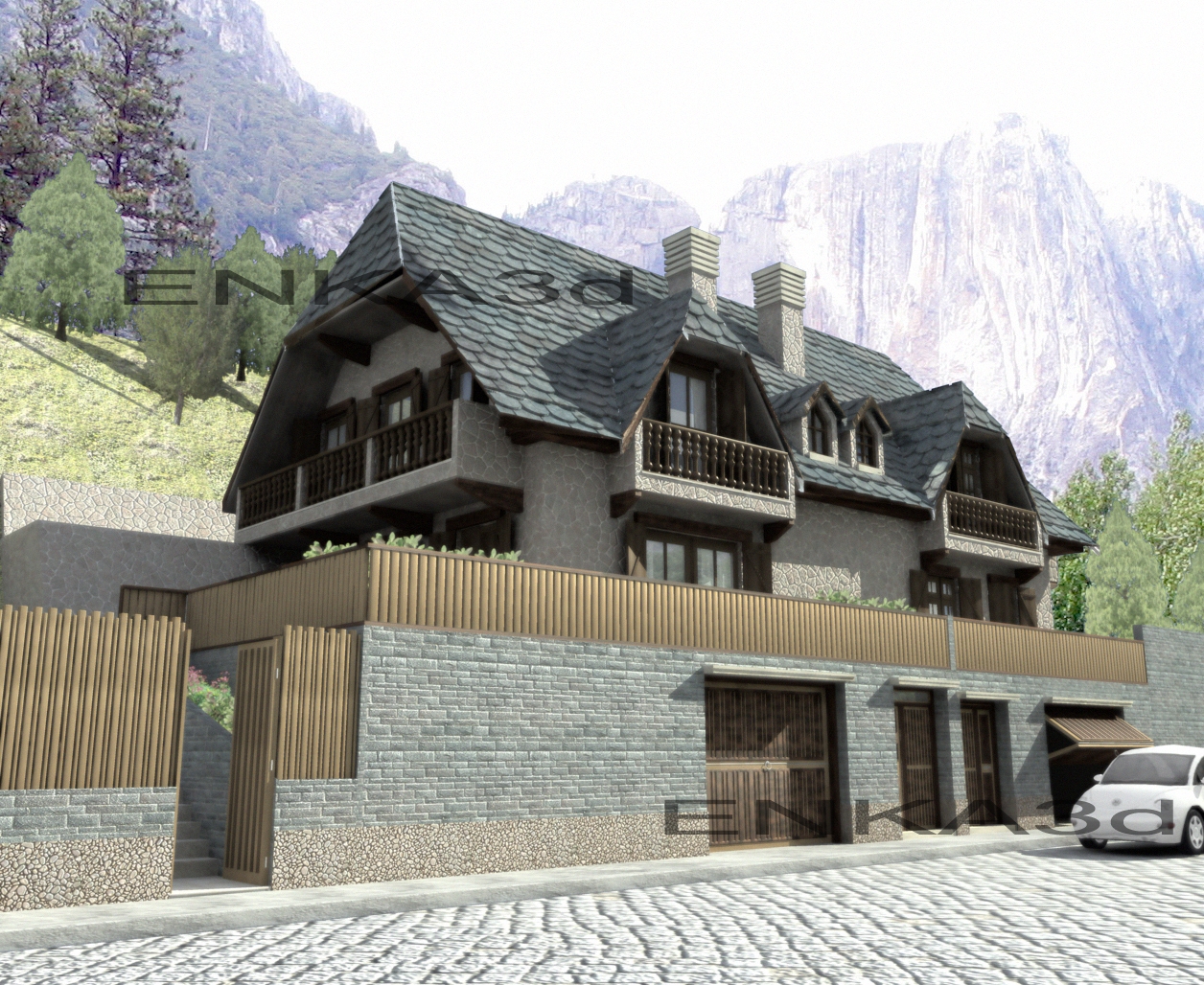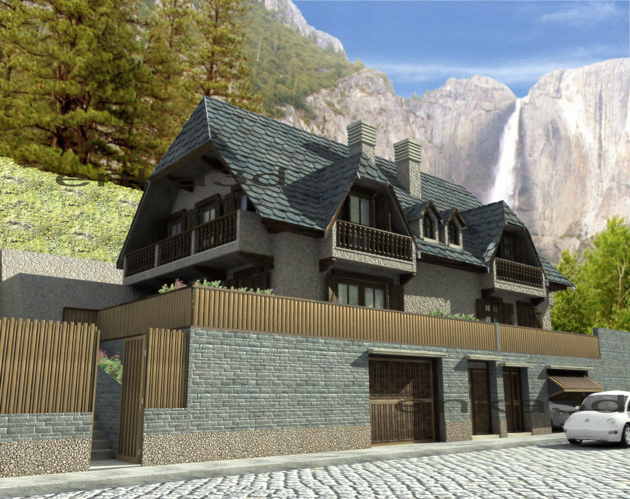 Hola chicos/as, estoy liado con esta casa (bueno en realidad son 2 casas pareadas) en el pirineo catalán, antes de dar por acabada la imagen, me gustaría que me dierais vuestra opinión a ver si la puedo dejar mejor, muchas gracias.