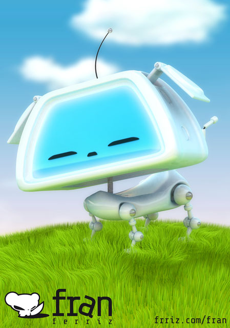Tenía por ahí un boceto de un personaje que era una especie de despertador con ruedas cuya cara era una pantalla de cristal líquido donde hacía smileys con las barritas de las horas. Me ha recordado un montón a este trabajo. Sólo le cambiaría el césped, que parece pelo. El resto me encanta, y estaría bien que en uno de estos trabajos hicieras un tutorial paso a paso para saber cómo consigues esos materiales y cómo haces todo el proceso. Un saludo, colega.