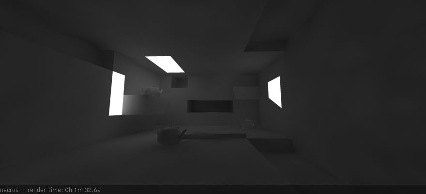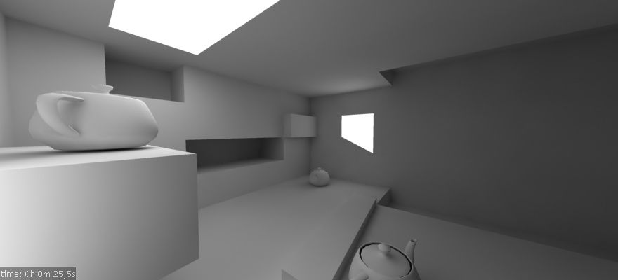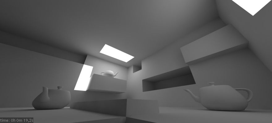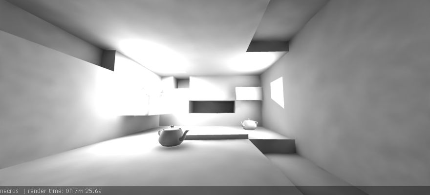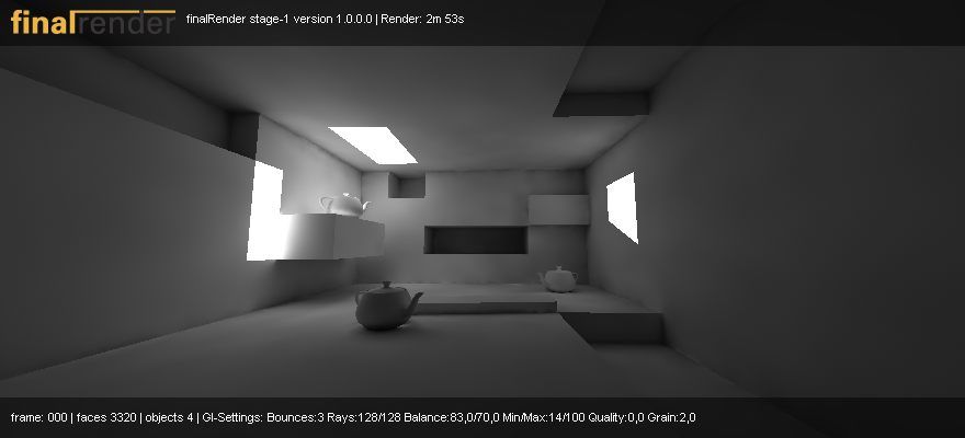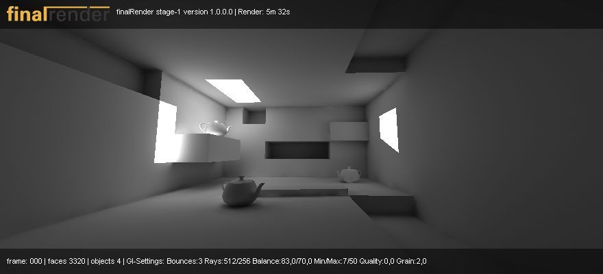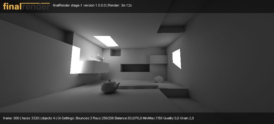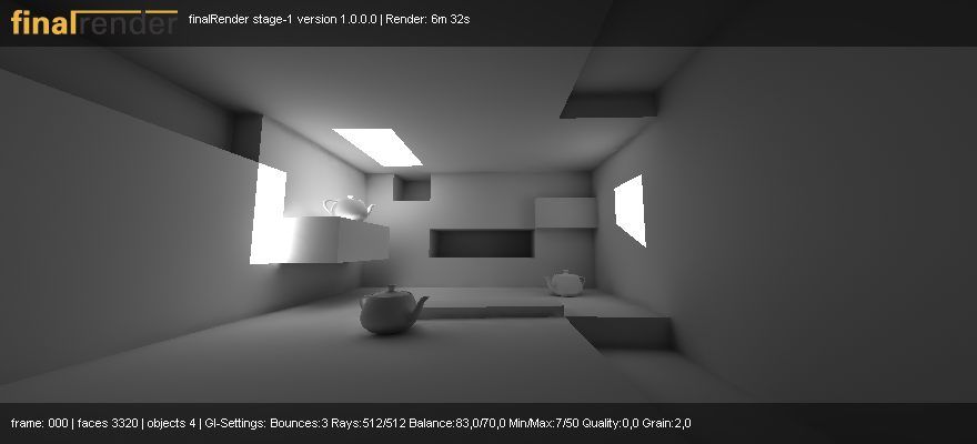 Solo hay un material blanco sin texturas, y el antialiasing está deshabilitado. De este modo, quiero analizar solo el GI, sin coste alguno sobre otros cálculos. Yo solo me voy a centrar en el FinalRender. Pero me gustaría, para completar este análisis, que alguien o algunos hagan las correspondientes pruebas en Vray y Brazil. De modo que colocare el archivo max para poder descargar.