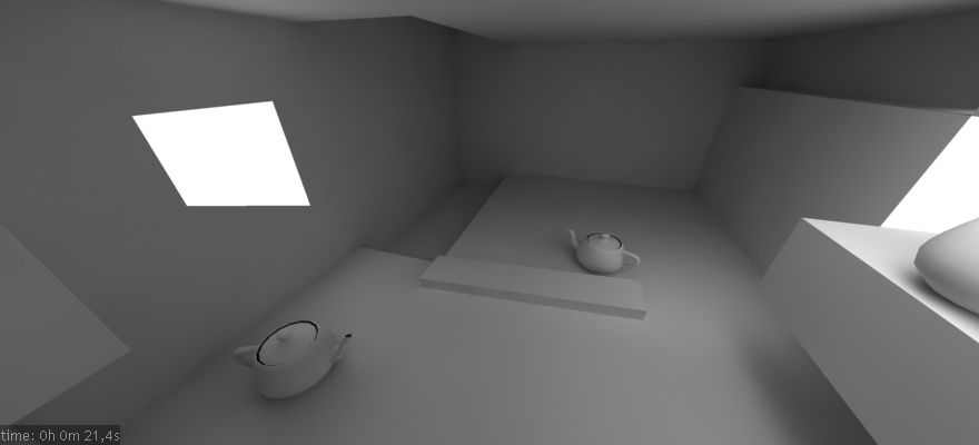 Cómo es posible que tarde 36 segundos para renderizar una imagen tan simple sin antialiasing y con la iluminación ya calculada hice pruebas con Tbaker y cree las texturas con la solución GI aplicada. Tiempo de render con estas texturas calculadas, 9 segundos sin antialiasing. Esto ya es más correcto. Pero no pude alegrarme demasiado porque algunas zonas mostraban errores de cálculo increíbles. Especialmente algunas esquinas y las teteras.