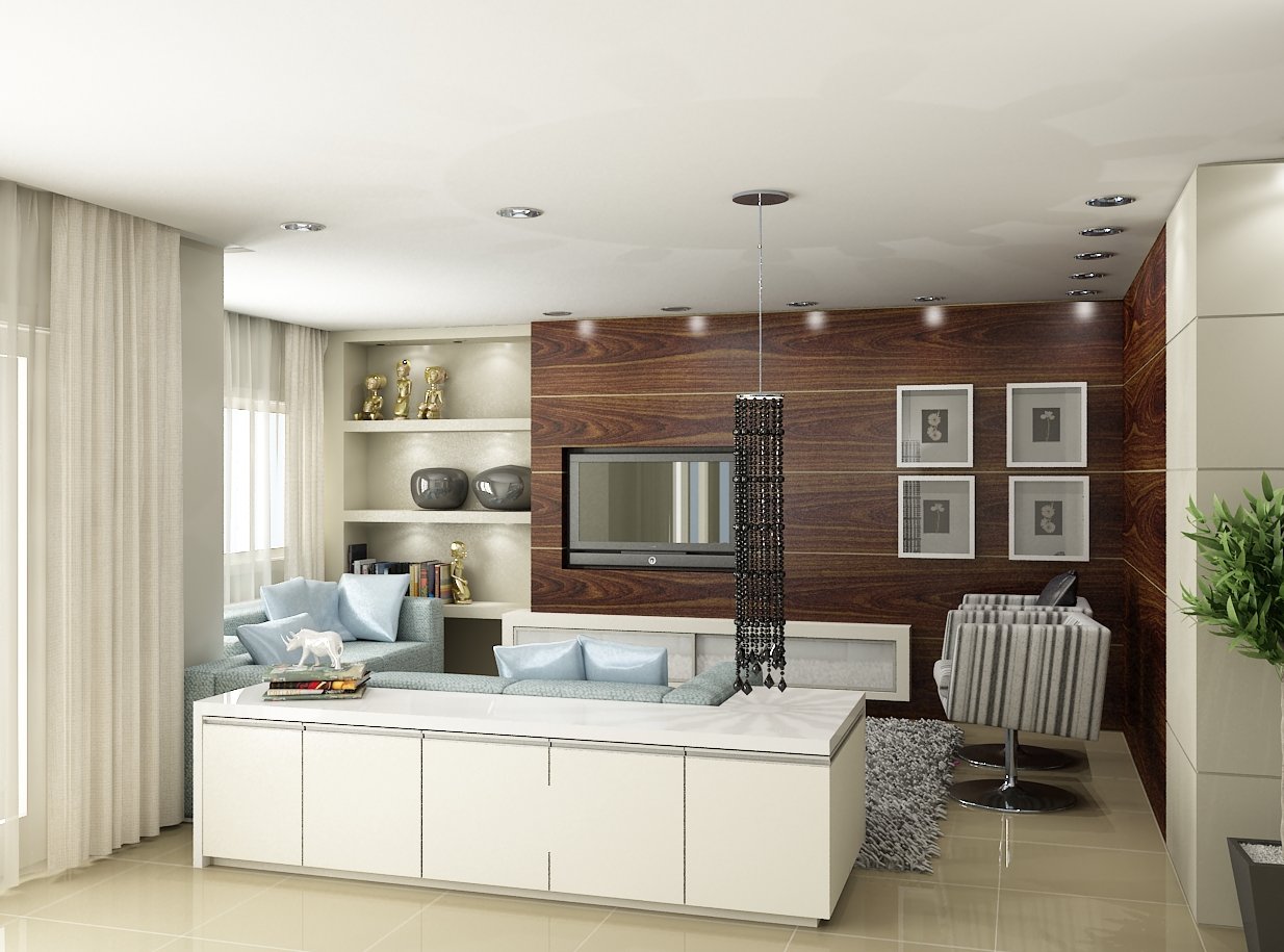 Está muy bien. Coincido en lo de la alfombra y el reflejo de la televisión. Una de las juntas del mueble blanco parece cortada y el mapa de madera veteada se repite demasiado.