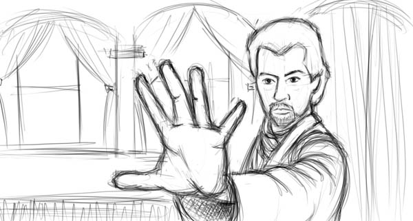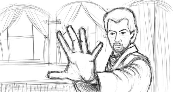 La mano me gusta mucho. Pero me da la impresión de que el hombre tiene mucho cráneo y algo torcido (o un pelo muy voluminoso, claro), el torso pequeño, el hombro muy bajo teniendo en cuenta que tiene el brazo levantado, y que has aplicado perspectiva a la mano, pero no al antebrazo, que es lo inmediatamente anterior.