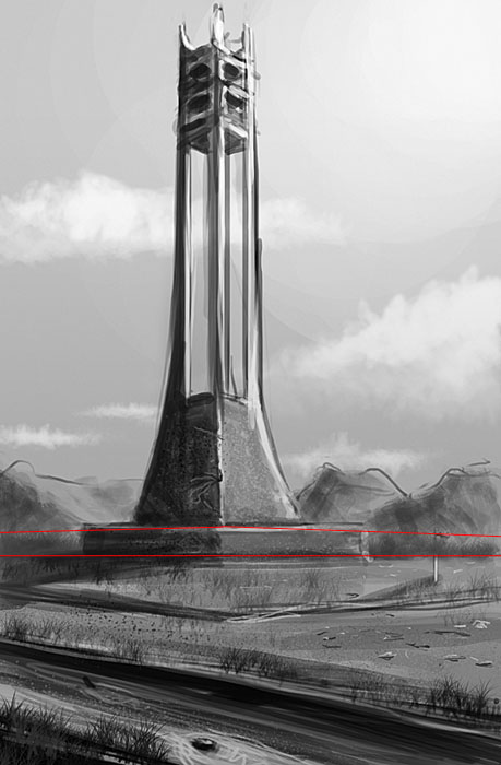 No tengo mucha idea de perspectiva, pero, creo que viendo dónde están los puntos de fuga de la torre y la línea del horizonte hay un pequeño error en la base. Como explicándolo tardaría mucho, he hecho unas líneas sobre tu dibujo, espero que no te moleste.