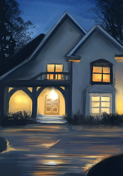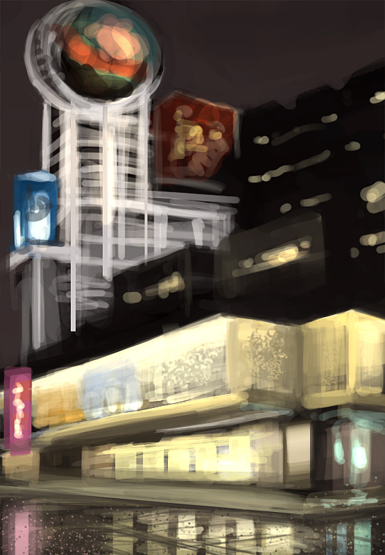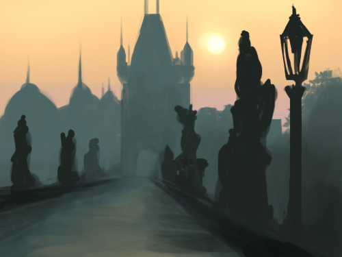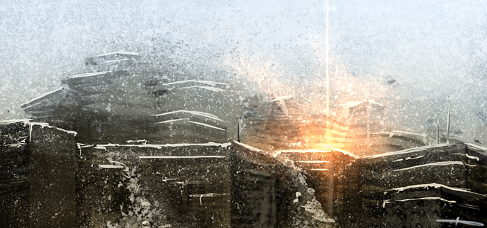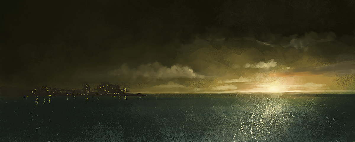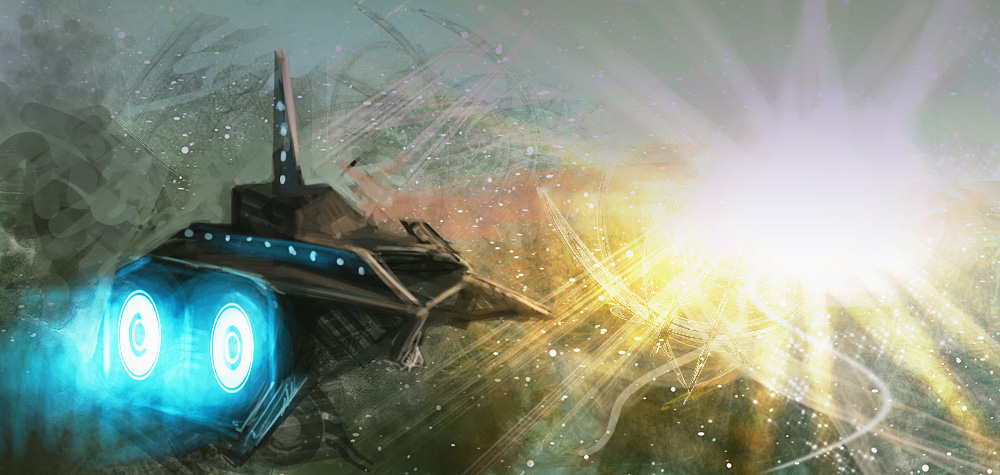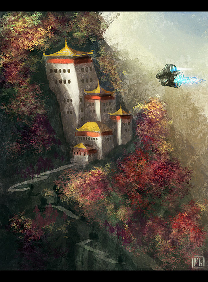 Ese guarreo no está mal, da un ambiente entre claroscuro relazado por los blancos y amarillos de las casas, y el FX azul de la nave, es guapissimo, me vas a tener que pasar algún pincel, vaya tela.