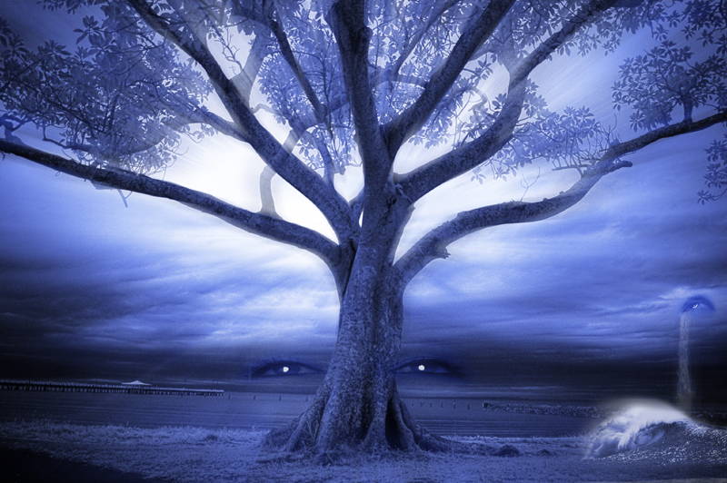No está mal la idea, pero yo hubiera puesto los ojos (a mí me parecen ojos) más arriba en superposición con el cielo, y hubiera elegido (o retocado este) un árbol con el tronco más fino para que no pareciera que la chica tiene una nariz deforme.