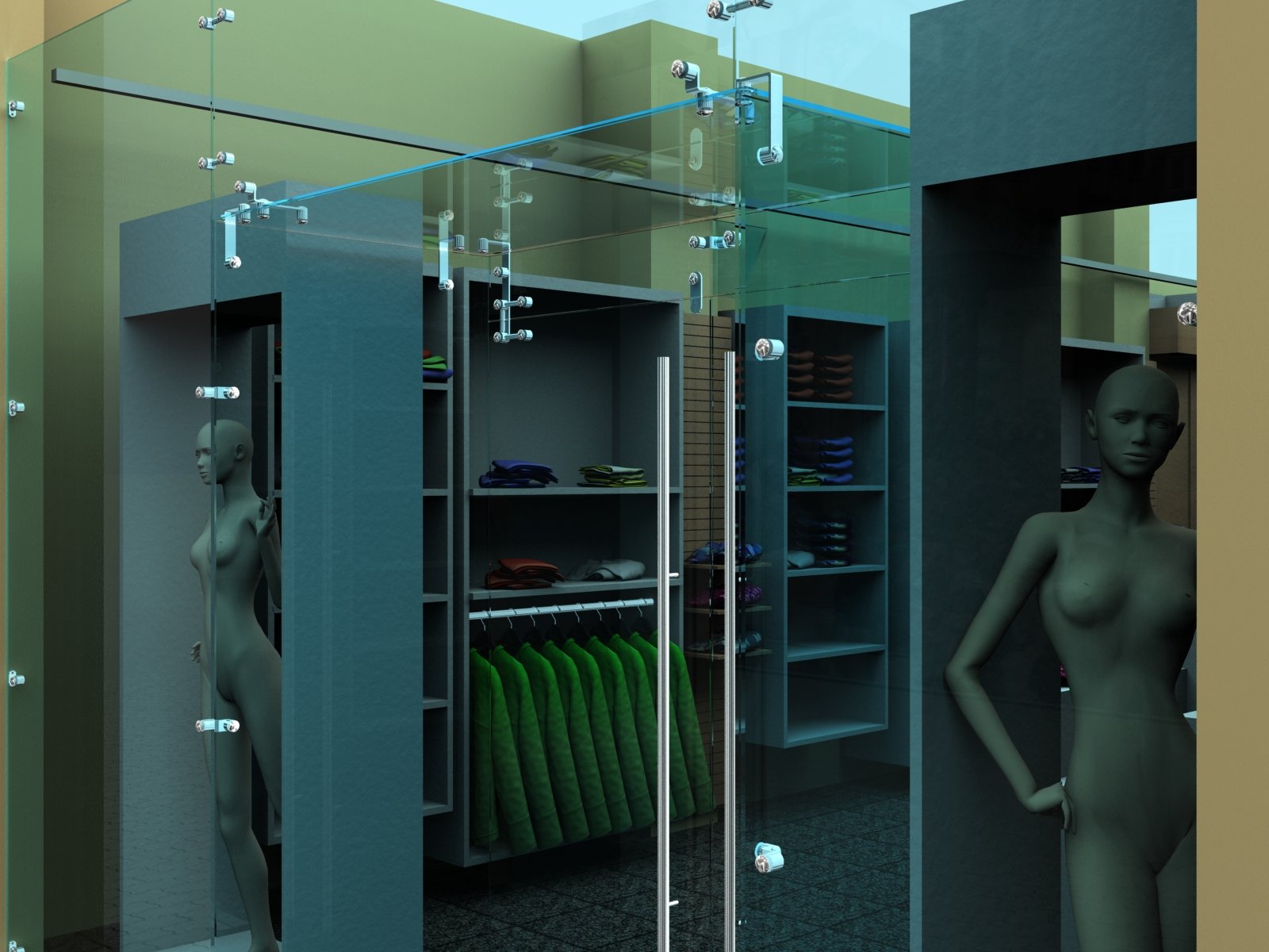 Hola a todos, una tienda de ropa quiere un escaparate para uno de sus nuevos locales. Como lo que interesa en cuestión es el vidrio del escaparate lo he coloreado muy descaradamente de azul.