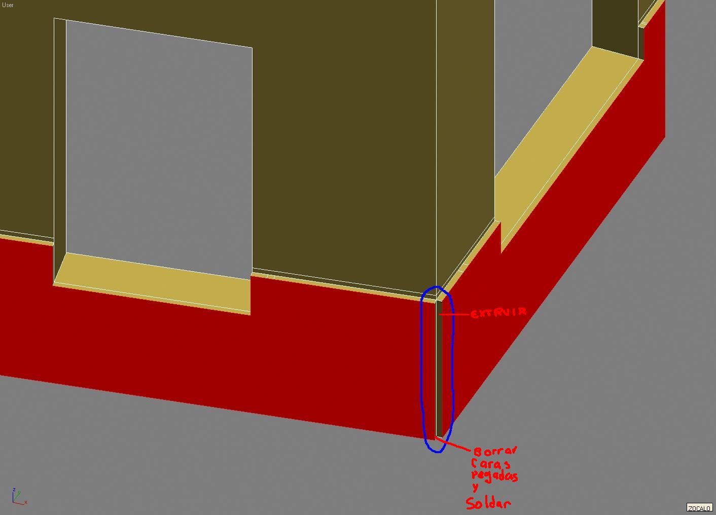 Hola a todos, acabo de extruir esos polígonos para hacer el zócalo de esa fachada y en la esquina se me queda ese hueco vacío que he marcado en la imagen. ¿cómo puedo rellenar esa esquina partiendo de la misma malla? Gracias y saludos.