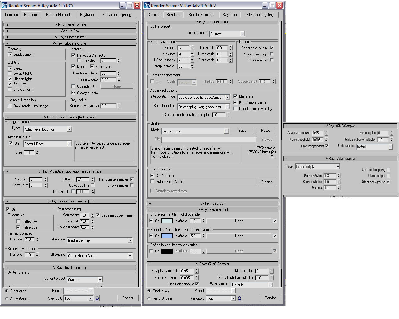 Lo que has cambiado del render, era más que nada para que te tardará la mitad en renderizar y quedará más o menos igual, también podrías bajar el min rate a -1 del adaptative subdivisión image sampler, vamos, si más no mientras sacas pruebas así yo lo pondría en -1 y el Irradiance Map a -3 y -3 viendo que aún te tarda 30 minutos, y cuando ya veas que te sale todo ok pues pones los parámetros pro.