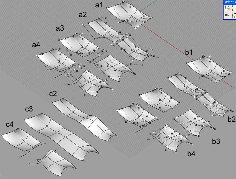 Aplicamos el comando surface > surface edit tools > Shrink trimmed surface, que son las superficies de la serie b. Vemos que ahora los puntos terminan donde las superficies. Si los bordes que, antes eran trimmed coincidían con isocurvas, como en los casos 2 y 3, ahora dejan de ser trimmed, y podemos aplicar matchsrf (c2, c3). Si los trimmed Edges no eran isocurvas, seguir siendo trimmed, como en b4, en que vemos que los puntos continúan un poco más fuera de la superficie, y el comando matchsrf da error. Igualmente, si en b2 los cortes fuesen de curvas proyectadas, en vez de isocurvas, después del Shrink no funcionara el match. Porque los Edges siguen siendo cortados por trimmed Edges.