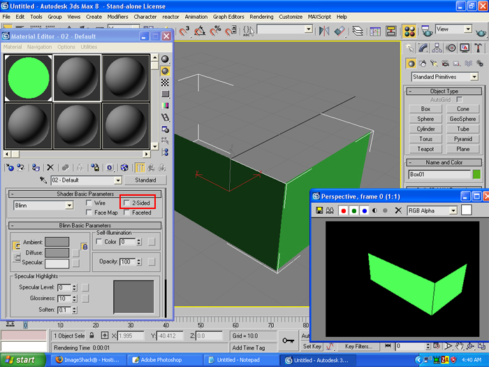 Esto es lo que he llegado ha conseguir. Hablo de las hojas de prueba que he estado haciendo, en este caso cogí un plane le aplique un mapeado de color azul con 2-sided y el resultado era que tenía en ambos lados el mismo color aplicado, bien ahora pillé y le hice un extrud, en este caso hacía el lado digamos, antes, invesible. El resultado es el mismo, o peor. Demonios, yo solo quiero una hoja con dos bitmaps diferentes en sus lados a partir de Spline.