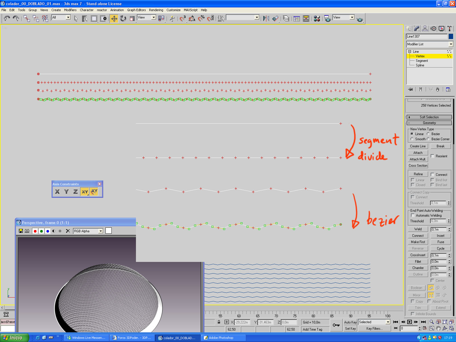2: dibujar una línea, hacerla Spline editable, en segmentos ir a divide y dividirla en 100 segundos. Seleccionar vértices alternos y bajarlos un poco. Seleccionar todos los vértices y hacerlos Bézier, dejo la interpolación en adaptative.