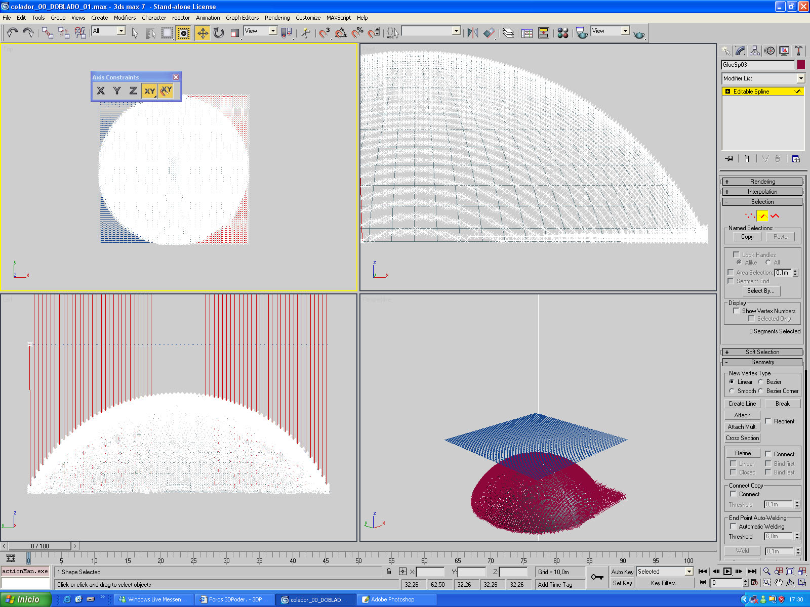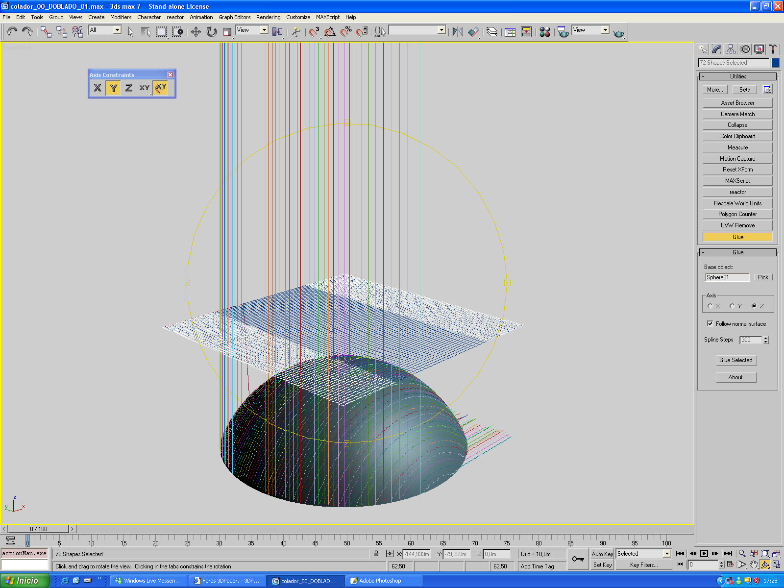 5: para arreglar los errores, atacho todas las Splines Glue en una sola, y a nivel de subobjetos, en segmento, borro los que se salen de la superficie de proyección, la esfera.