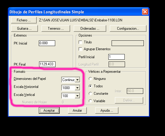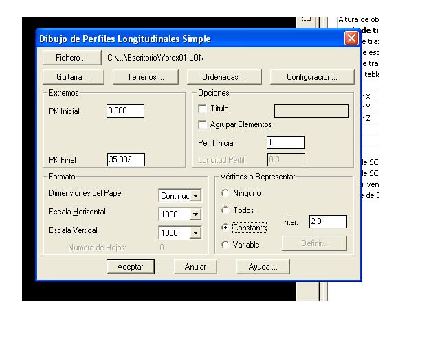 4. Longitudinales/dibujar perfil simple. Seleccionamos el archivo.lon que acabamos de crear. Deja si quieres las opciones por defecto, y cambia solo la escala, para que salga a 1:1 (0 100:100, o 1000:1000). Ya afinaras la guitarra y todo eso más adelante.