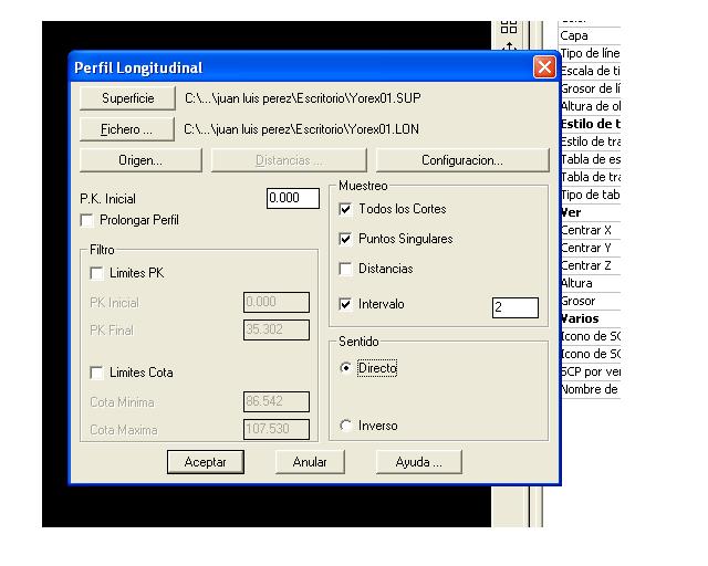 3. Longitudinales/obtener perfil. Nos pedirá un fichero. Le indicamos el fichero del eje que hemos creado anteriormente. En la ventana que aparece, nos aseguramos que arriba del todo el archivo de superficie es el de nuestra superficie, y el archivo fichero es donde va a guardar el longitudinal (extensión.lon). En muestreo, marca todos los cortes y pon además un intervalo de 2 m. Con esto obtendremos un archivo.lon.