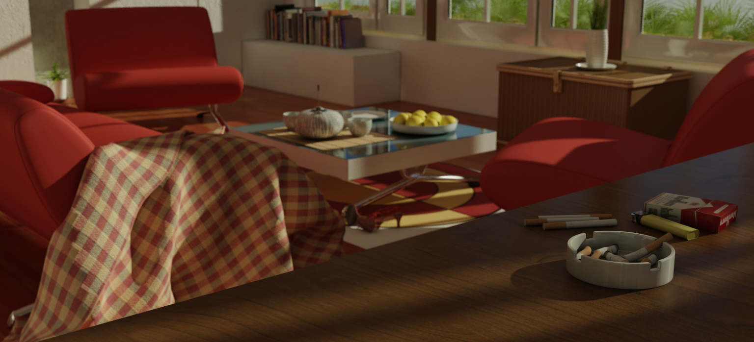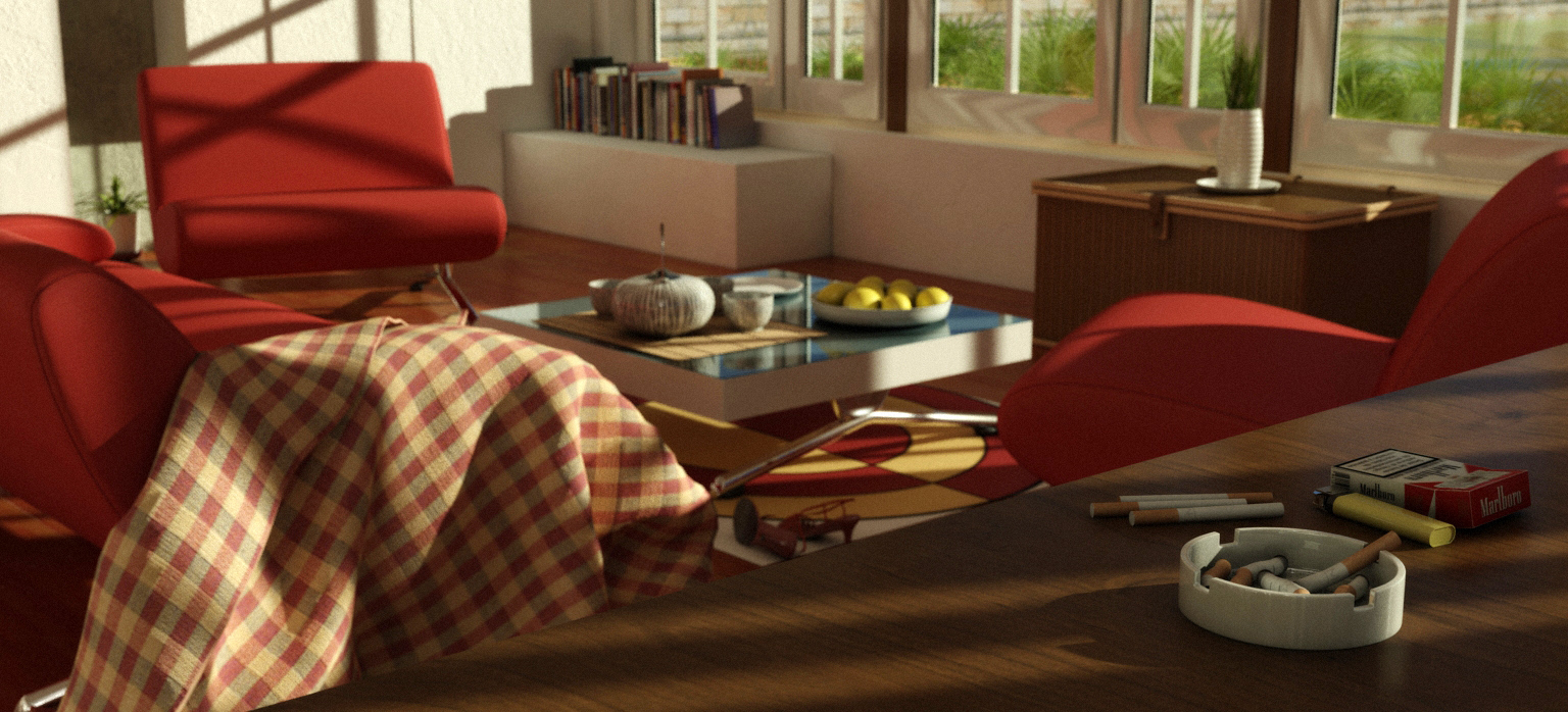 Hola Pit, gracias por el comentario, y a ti también pedrote. Bueno la planificación de esta escena no existió nunca, porque en un principio me la plante como un ejercicio de iluminación y lo que hice fue construir una geometría sencilla como vivienda y luego poner y modelar algunos objetos, como la manta que es un modelado con Cloth y que me dió pie a hacer una animación de caída, luego se ponen los materiales y las luces y a jugar con el motor.