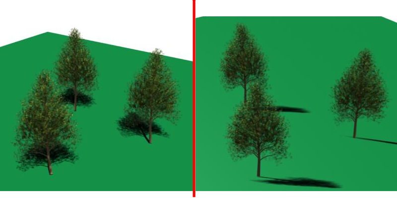 A mí me parece que no importa qué tipo de árbol u objeto utilices, si cambias la posición de la cámara o utilizas otra cámara con otro punto de visión, la sombra va a variar, a menos que muevas lo que origina la iluminación, en tu caso la direct.