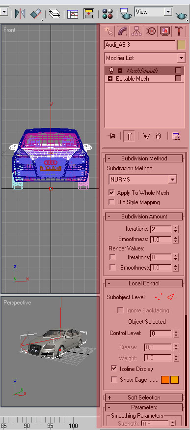 Hola a todos, y gracias por vuestro tiempo de antemano. Mi problema es el que sigue. Como podéis ver en la imagen, el modelado del Audi A6 de Dosch design no es en absoluto liso. Se marcan las caras de las mallas y no se a qué se debe. Lo curioso es que esto me ocurre en el AutoCAD 2007, mientras que en la versión de 2005 la terminación de las caras es mucho mejor.