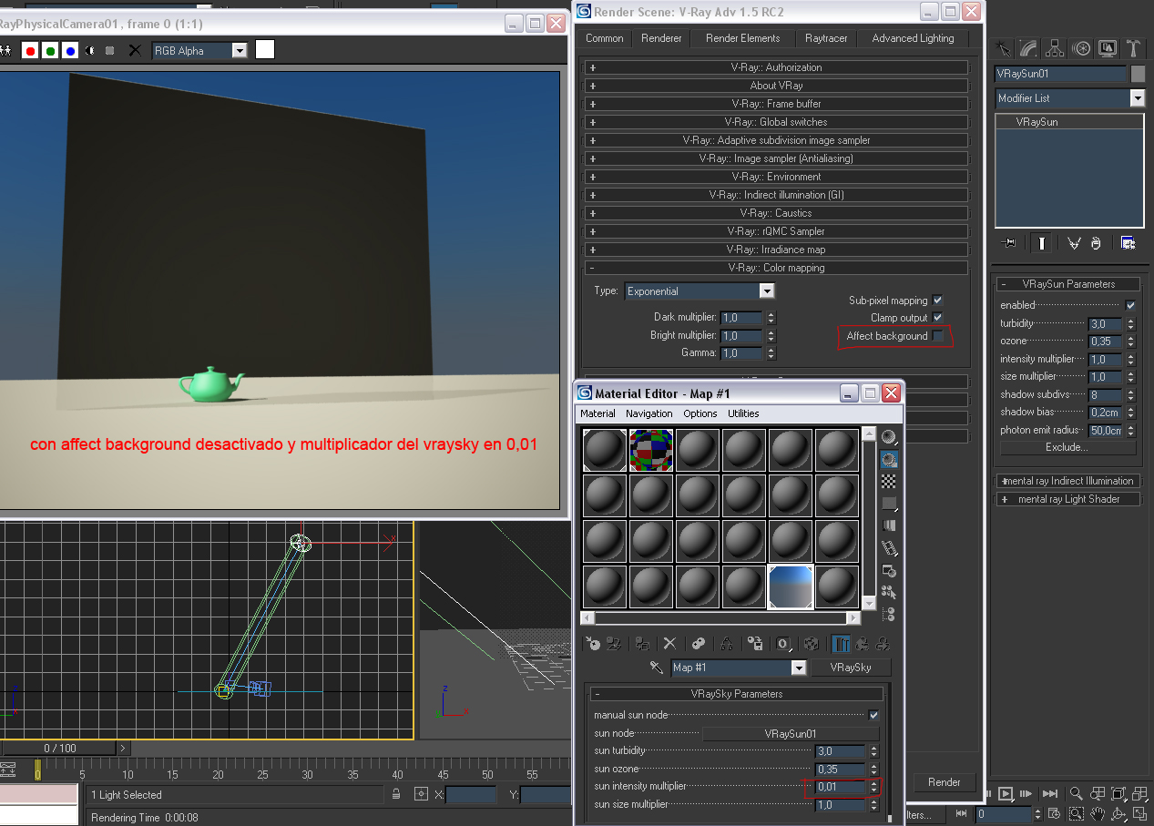 ¿Qué multiplicador tenía el Vray Sky de tu escena? Pues el mío era 0,01.