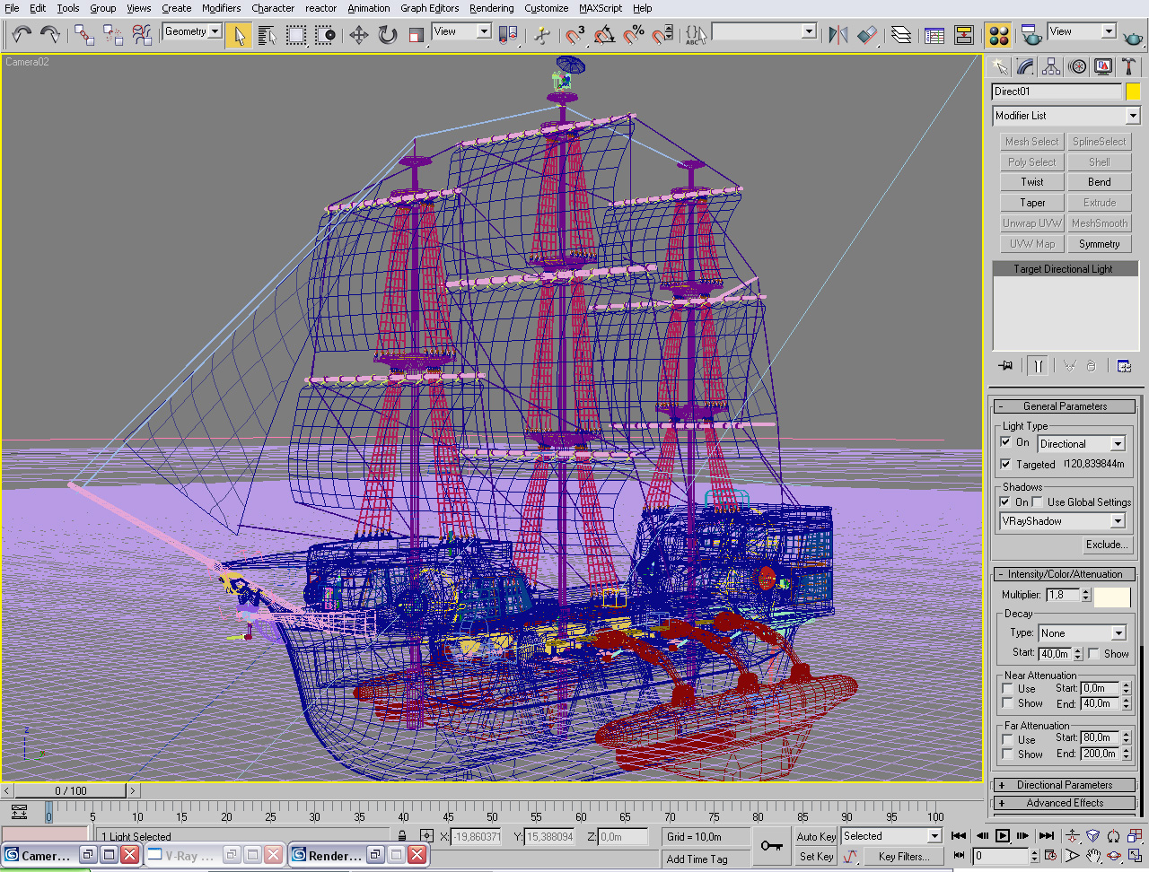 La cubierta parece chapa de madera, mete unas buenas tablas. Añade una estela detrás del barco y que se vea como rompe las olas, éstas al mismo tiempo deben ser más pronunciadas. La tierra del fondo parece recortada, dale algo de detalle simulando algo de vegetación o cúbrela con una neblina para disimularla un poco. La malla se ve muy aprovechada, justo lo que se necesita, lo demás muy bien por ahora, buen trabajo, esperemos los avances. Saludos.